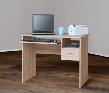 Moderner Schreibtisch aus melamin-beschichteter Spanplatte mit einem Schubkasten auf Metallschienen. Oberhalb dem Schubkasten ein kleines offenes Fach. Mittig ein Tastaturauszug auf Metallschienen.