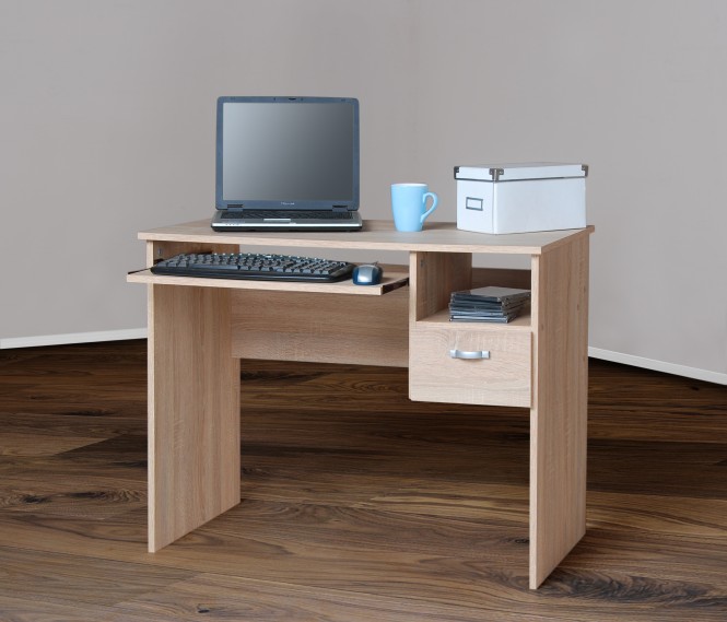 Moderner Schreibtisch aus melamin-beschichteter Spanplatte mit einem Schubkasten auf Metallschienen. Oberhalb dem Schubkasten ein kleines offenes Fach. Mittig ein Tastaturauszug auf Metallschienen.