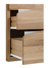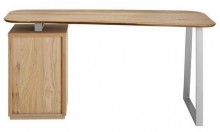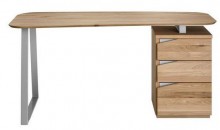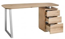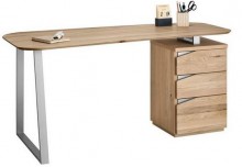 Die teilmassive Tischplatte sticht dank der abgeschrägten und abgerundeten Form ins Auge. Ein weiteres optisches Highlight sind die angeschrägten Schubkastenfronten mit farblich abgesetzten Applikationen. In den Schubladen steht reichlich Stauraum zur Verfügung, um Büroutensilien und Unterlagen unterzubringen.