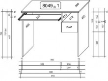 Moderner Schreibtisch aus melamin-beschichteter Spanplatte mit einem Schubkasten auf Metallschienen. Oberhalb dem Schubkasten ein kleines offenes Fach. Mittig ein Tastaturauszug auf Metallschienen.
